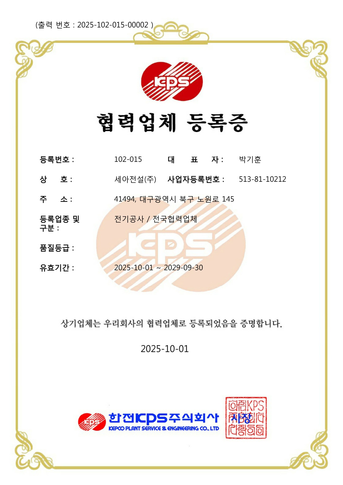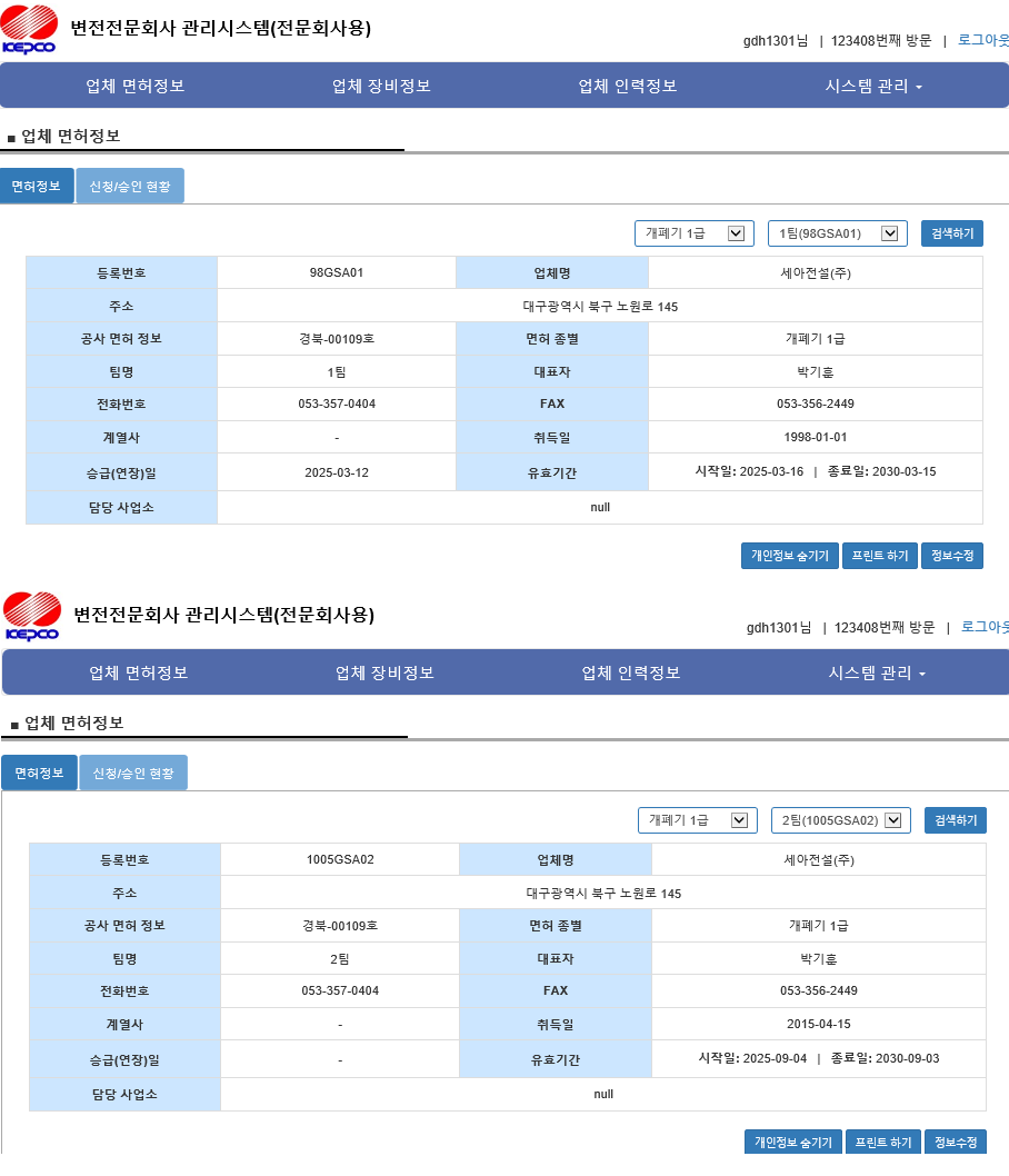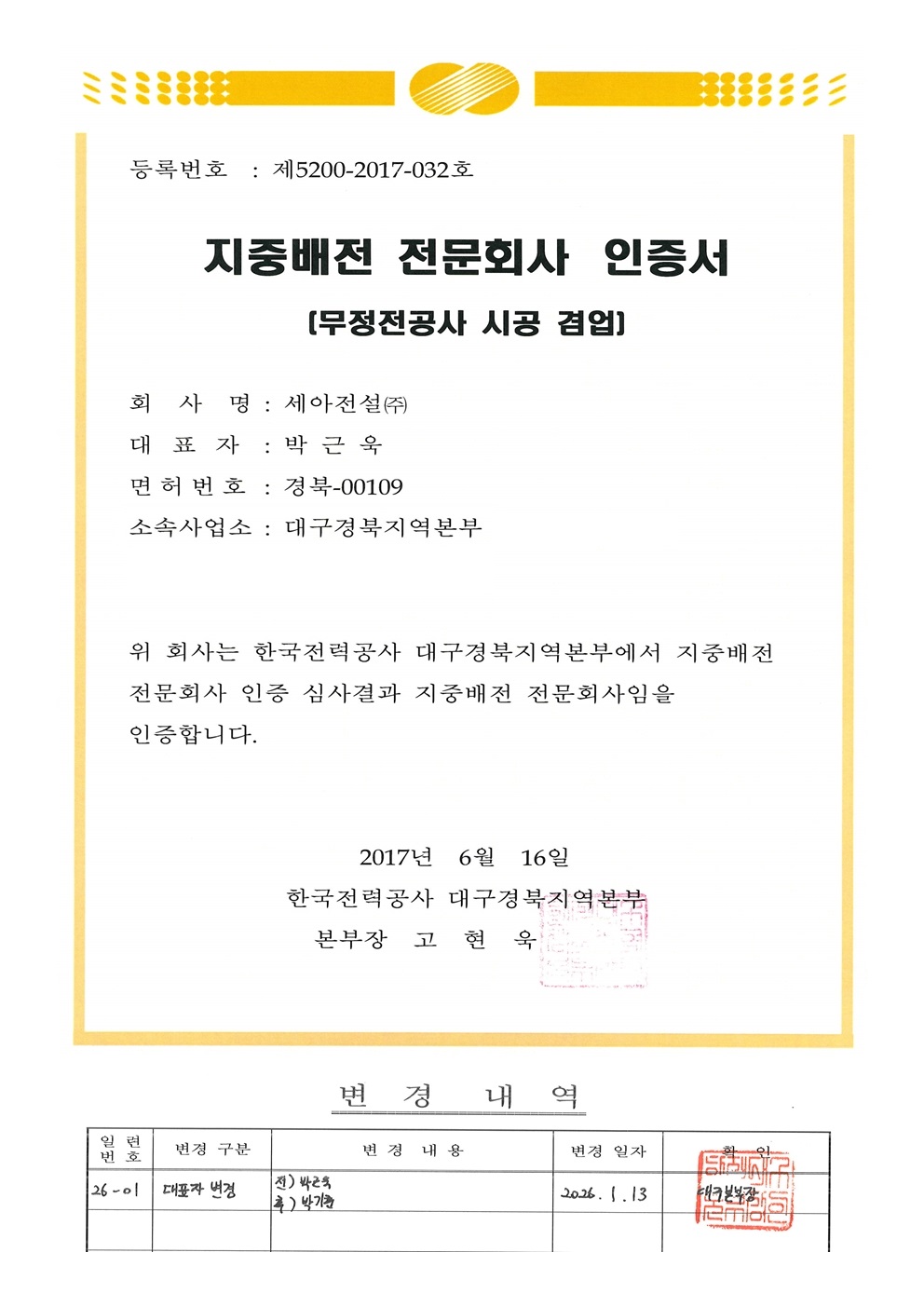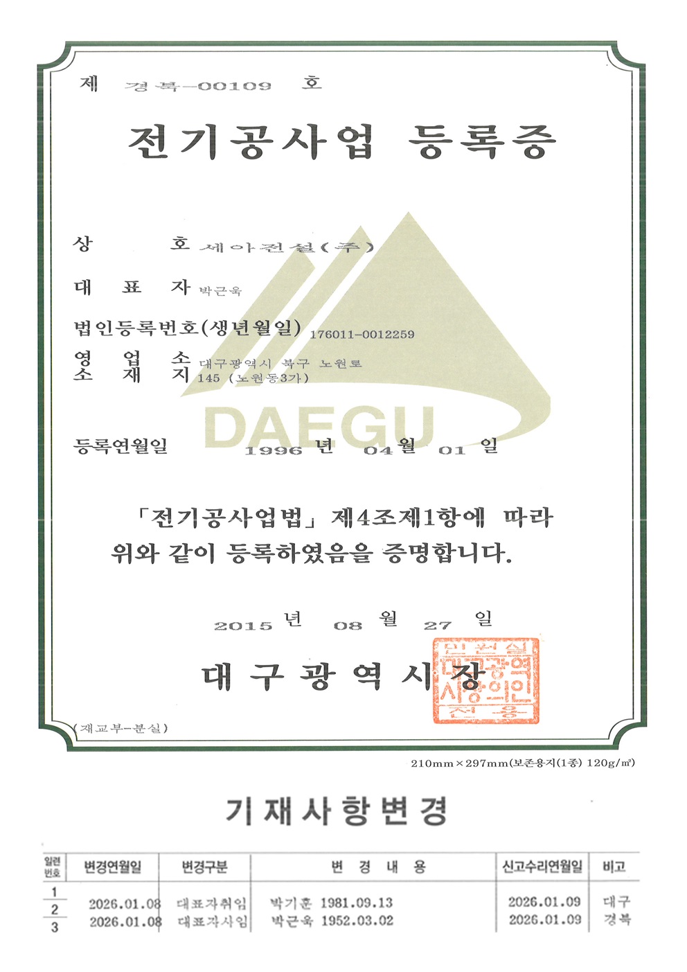 전기공사업 등록증 - 대구광역시