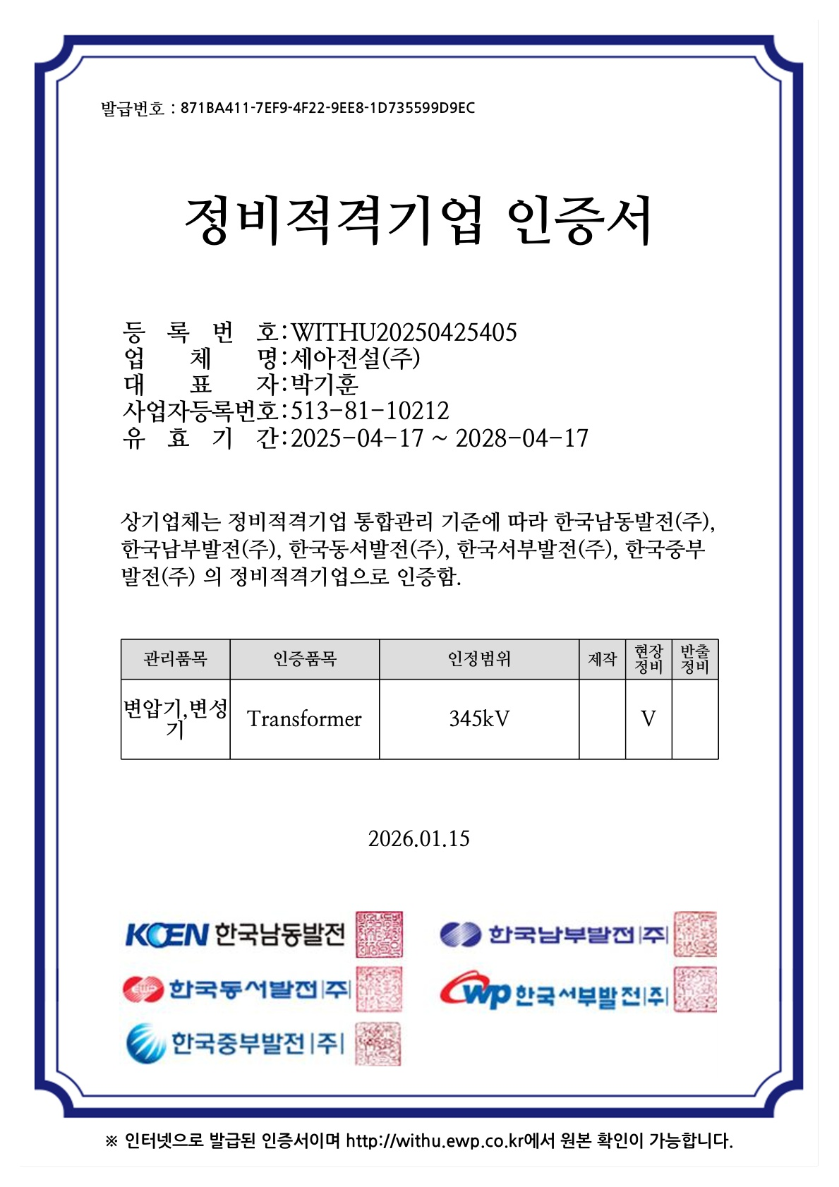 정비적격업체 인증서(Tr) - 5대발전자회사
