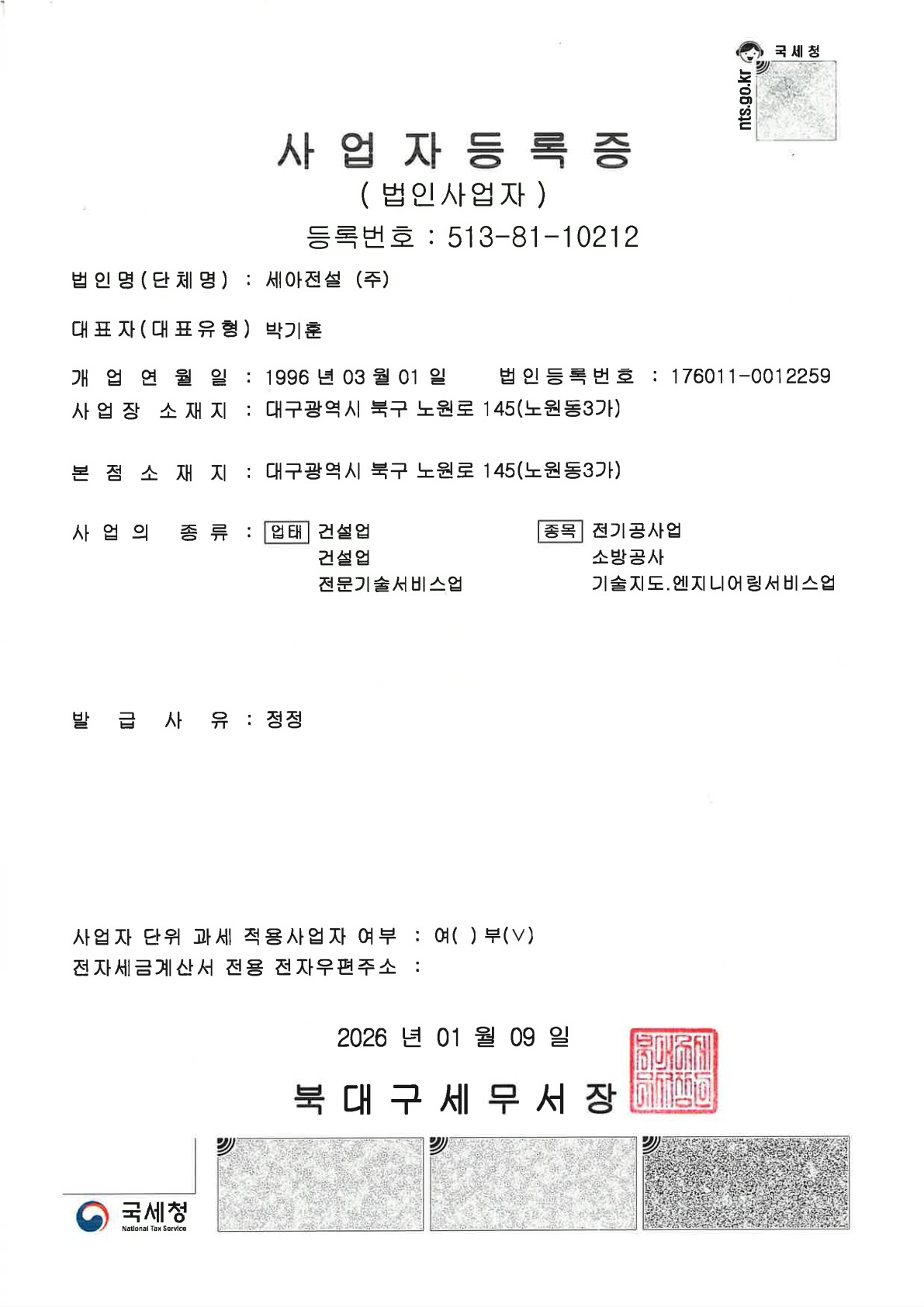 사업자등록증 - 북대구세무서