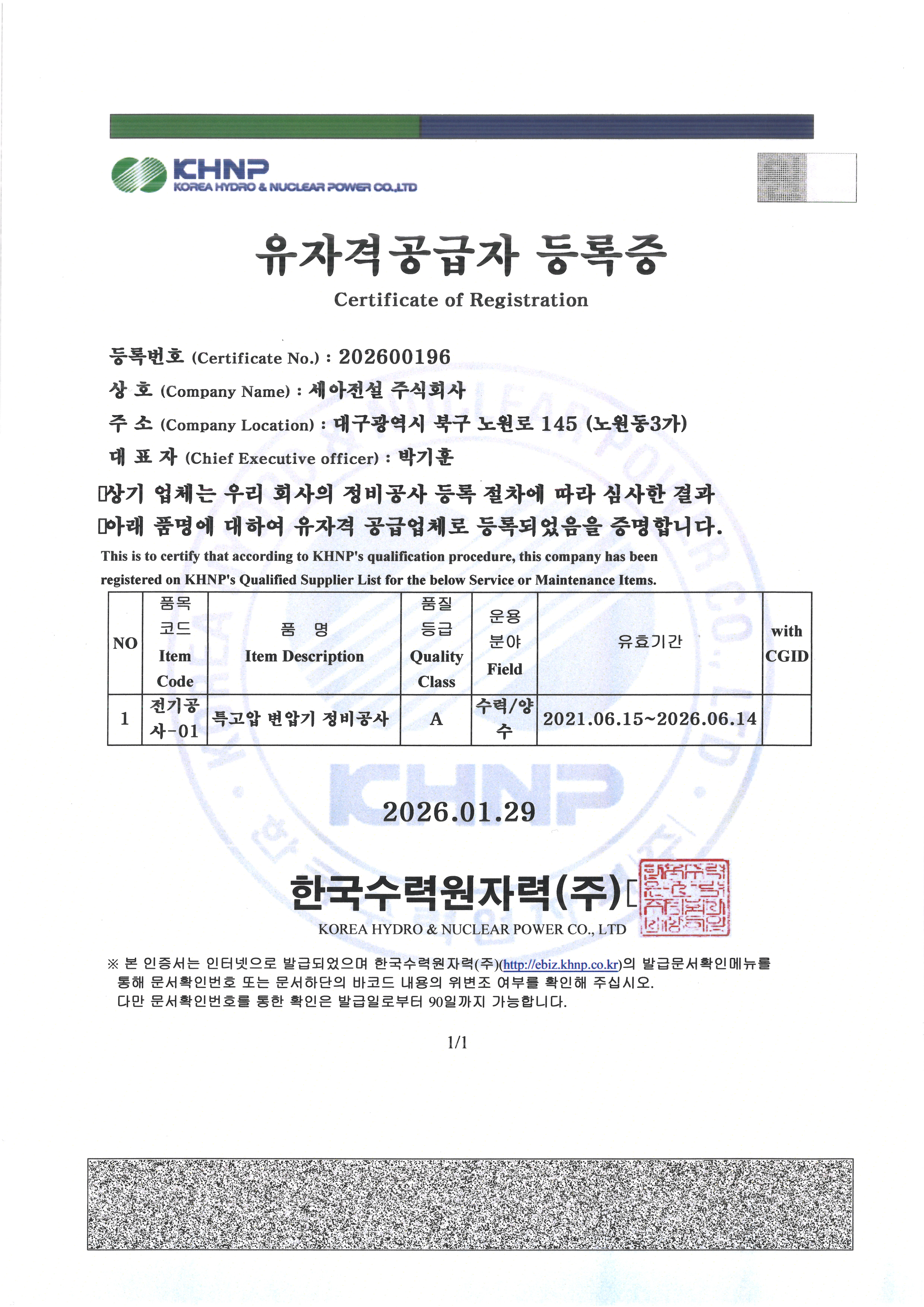 특고압 변압기 정비 등록증 - 한수원(주) 한강수력본부